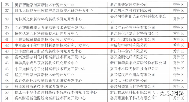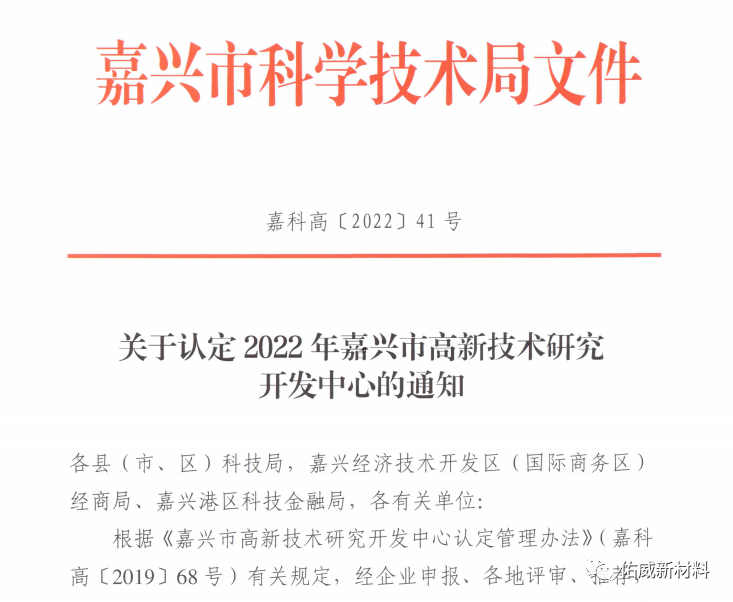 2022年7月6日,嘉興市科學技術局發布《關于認定2022年嘉興市高新技術研究開發中心的通知》,浙江佑威新材料股份有限公司下屬子公司中威航空材料有限公司申報的“高分子航空新材料高新技術研究開發中心”被認定為"嘉興市高新技術研究開發中心"。